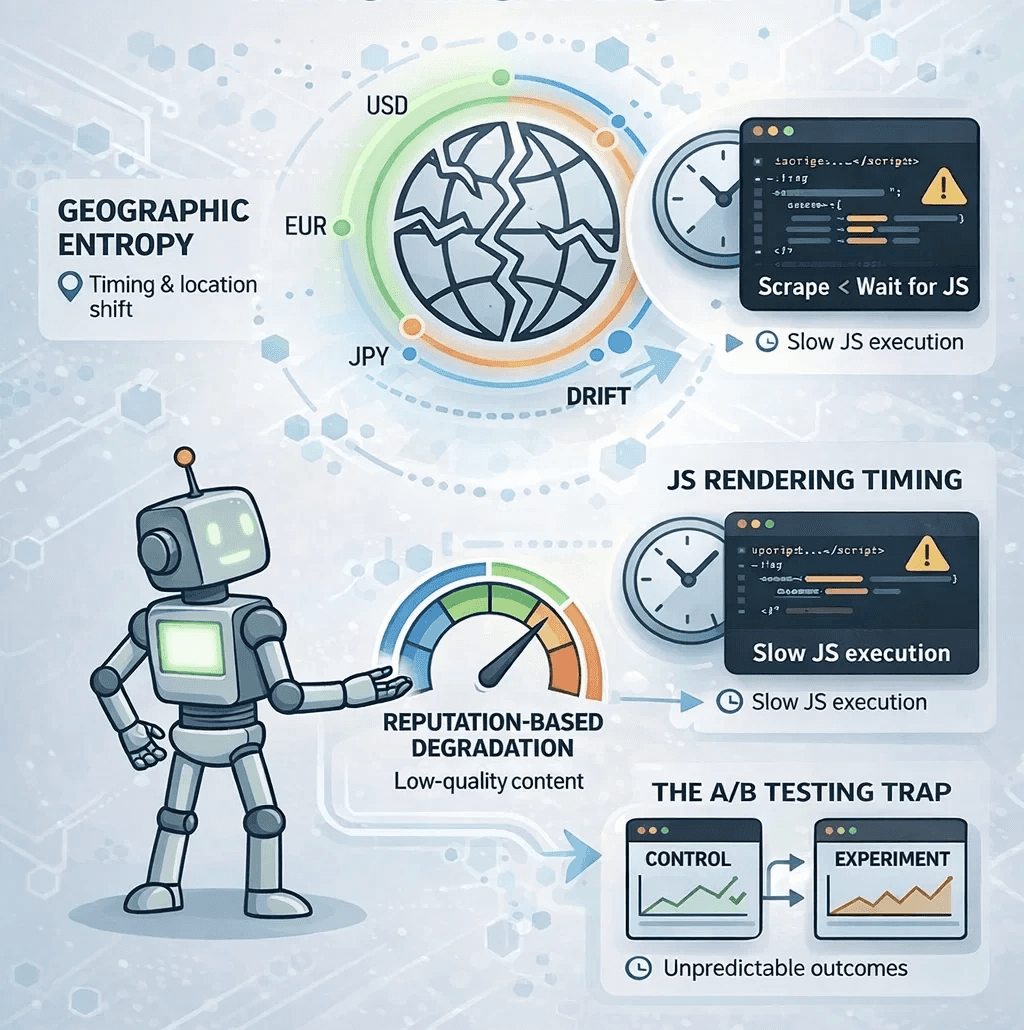We no longer scrape static documents; we scrape dynamic applications. This introduces four critical variables that cause "Data Drift":